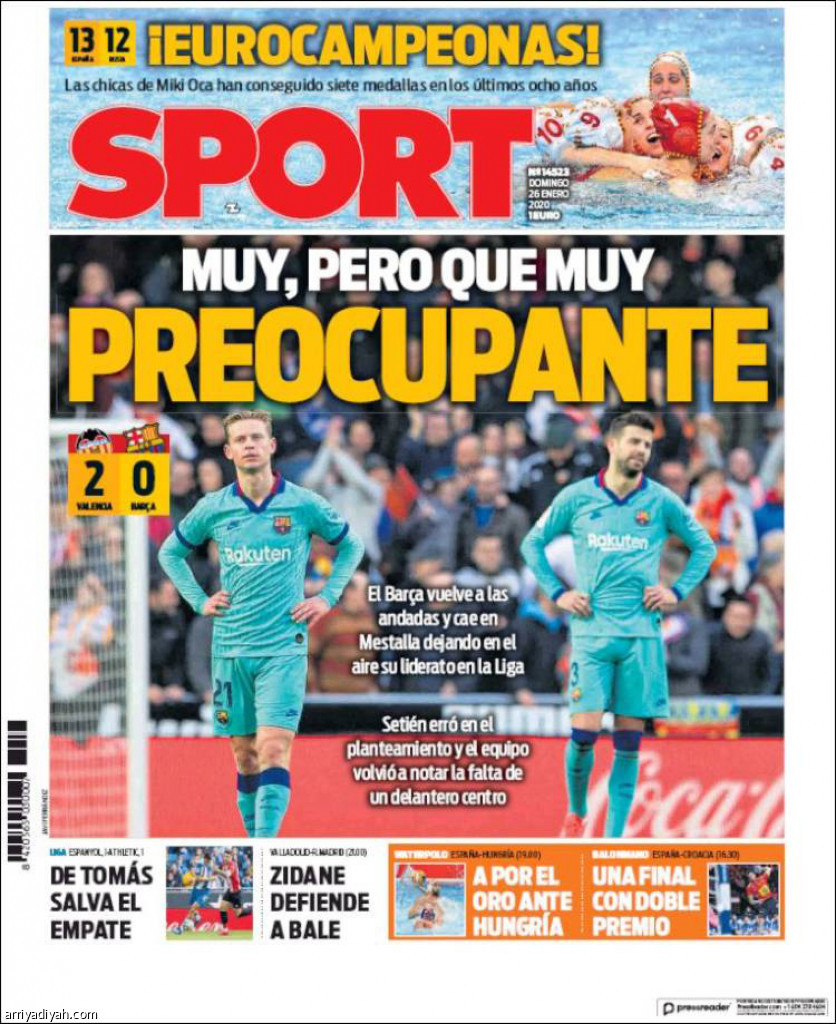 انتقدت الصحف الرياضية الكاتالونية، أمس، أسلوب فريق برشلونة، ووصفته بـ “المقلق” بعد سقوطه أمس الأول أمام فالنسيا 0ـ2 ضمن الجولة الـ 21 من الدوري، لافتةً إلى أن إنذار الخطر ما زال يدق أجراسه داخل “كامب نو”.