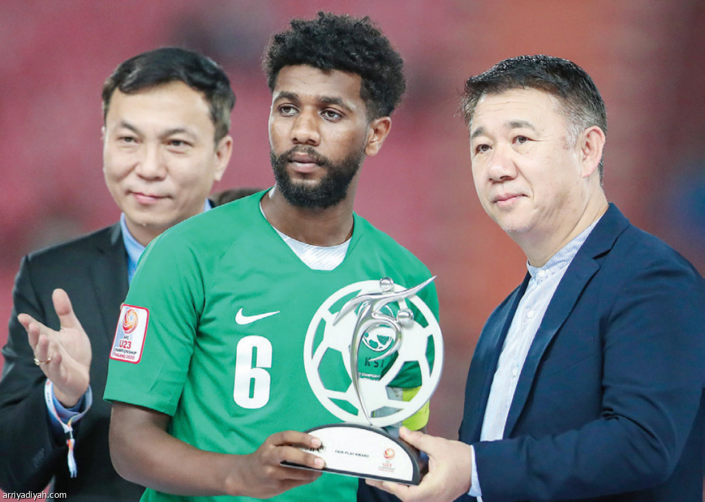 صورة التقطت أمس لسامي النجعي لاعب وسط وقائد المنتخب السعودي يتسلم جائزة اللعب النظيف نيابة عن زملائه بعد نهائي كأس آسيا تحت 23 عاما (المركز الإعلامي- اتحاد القدم السعودي)