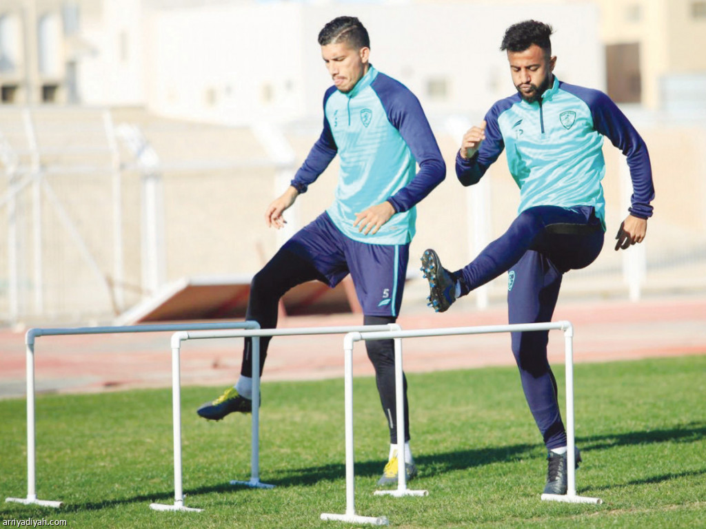 صورة التقطت أمس للمغربي مروان سعدان وماجد كنبة ثنائي فريق الفتح يؤديان تدريبات الإحماء (المركز الإعلامي ـ الفتح)