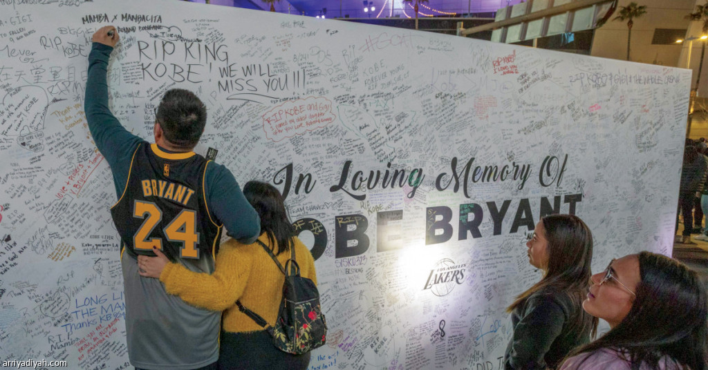 صورة التقطت أمس لمعجبين بكوبي براينت أسطورة كرة السلة الأمريكية يسجلون كلماتهم ورسائلهم على لوح ضخم في مركز ستابليس في لوس أنجليس للتعبير عن حزنهم لوفاته في حادث تحطم مروحيته الخاصة الأحد الماضي مع جيانا ابنته “13 عامًا” و7 آخرين في كالاباسا في كاليفورنيا