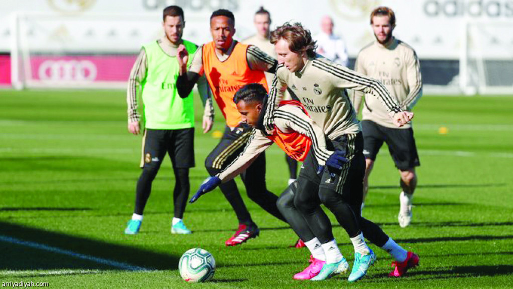 صورة التقطت أمس للكرواتي مودريتش والبرازيلي رودريجو في صراع على الكرة وسط متابعة من البرازيلي ميلتاو والبلجيكي هازارد والإسباني ناتشو في الحصة التدريبة لريال مدريد (المركز الإعلامي ـ ريال مدريد)