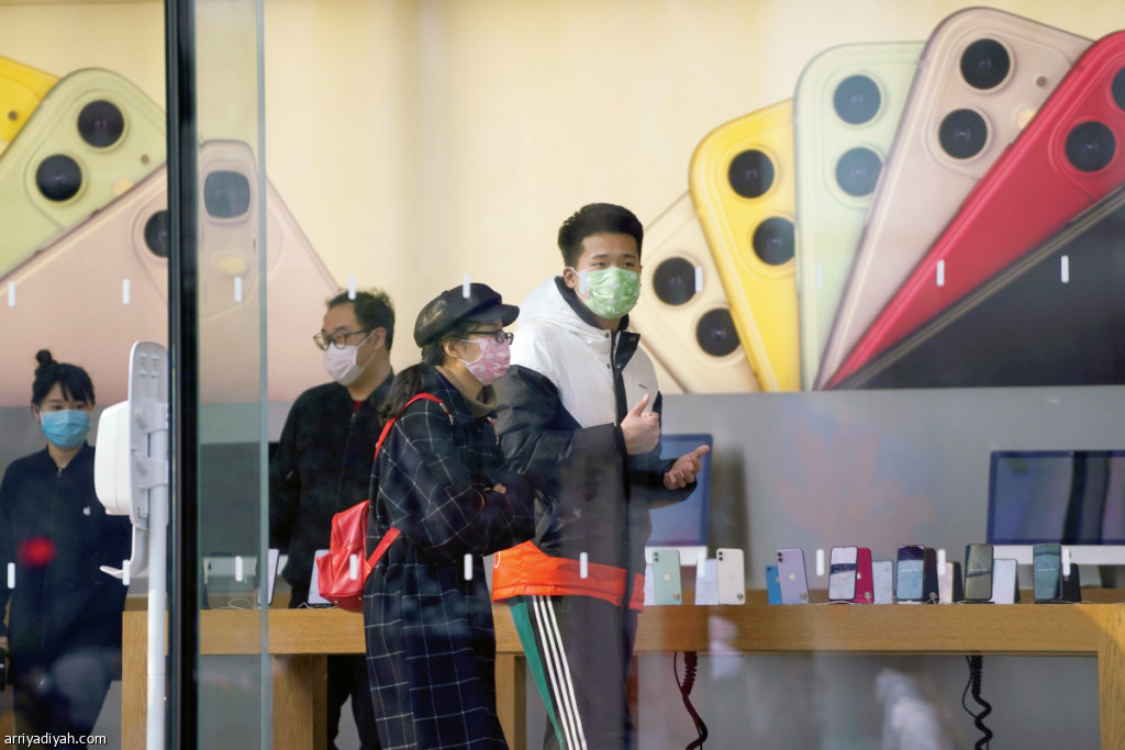 صورة التقطت لزبائن يرتدون “واقيات” خلال زيارتهم أحد متاجر أبل في الصين قبل قرار الإغلاق (رويترز)