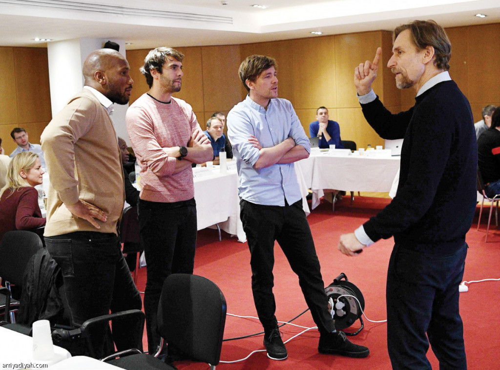 صورة التقطت أمس يظهر أحد المدربين يتحدث إلى كلِّ من الألماني كليمنس فريتز والبرازيلي كاكا والإيفواري ديدييه دروجبا اللاعبين السابقين أثناء مشاركتهم في إحدى جلسات البرنامج (الفرنسية)
