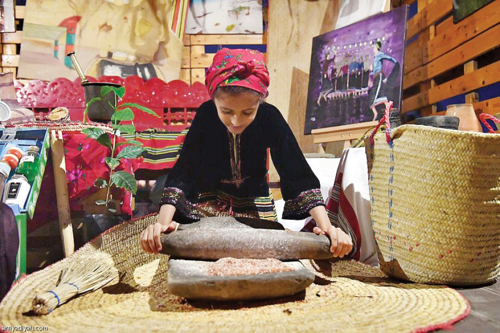 صورة التقطت أمس لفتاة أثناء استخدامها الرحا لطحن البن في المهرجان(واس)