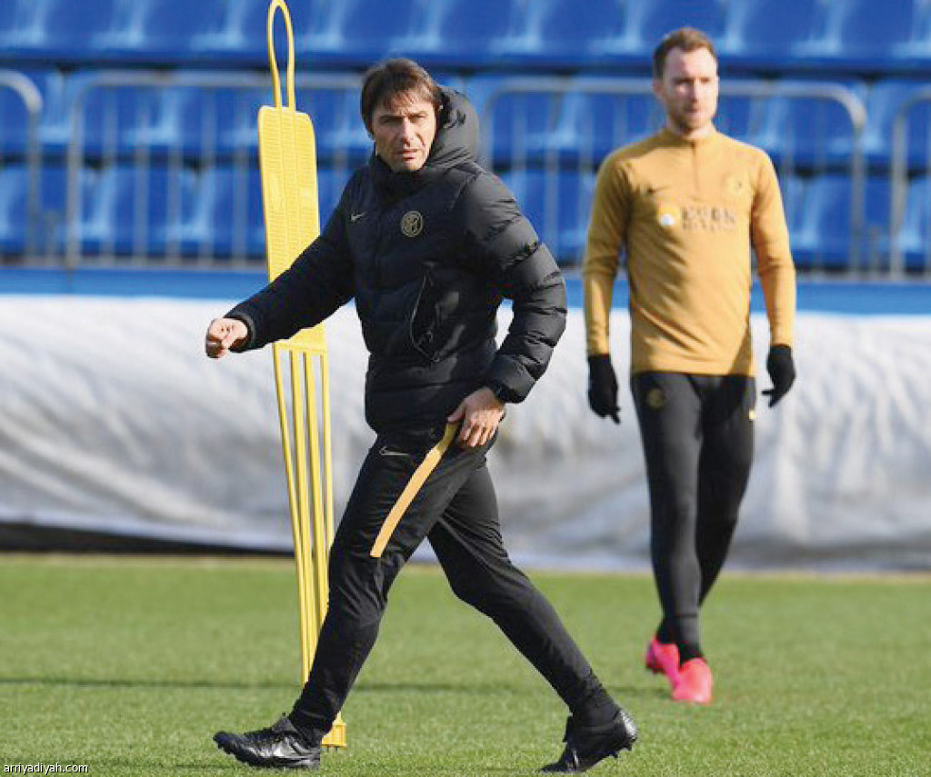 صورة التقطت أمس لأنطونيو كونتي مدرب إنتر ميلان وكريستيان إريكسن لاعب الفريق أثناء التدريبات(المركز الإعلامي ـ إنتر ميلان)