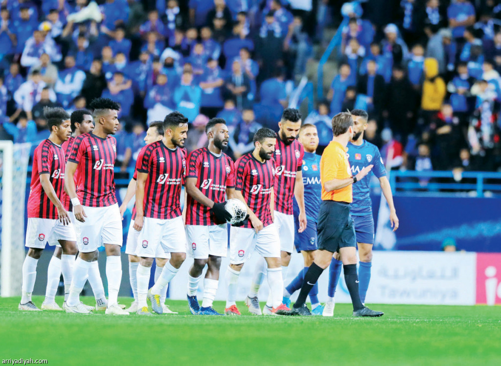 صورة التقطت أمس لأليكس الحكم البيلاروسي الذي قاد مواجهة الهلال والرائد ويظهر لاعبو الرائد معترضين على قرار احتساب ركلة الجزاء الثانية لمصلحة الهلال تصوير: علي الظاهري
