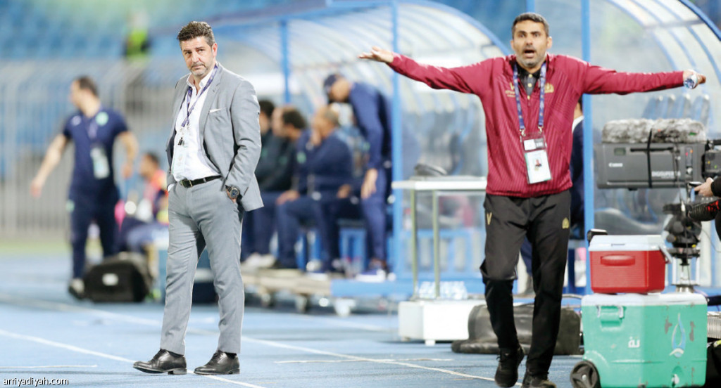 صورة التقطت أمس لعايض القحطاني مدير كرة النصر يعترض على بعض القرارات ويظهر بجانبه البرتغالي فيتوريا متعجباً من ضياع بعض الفرص تصوير: فهد المري