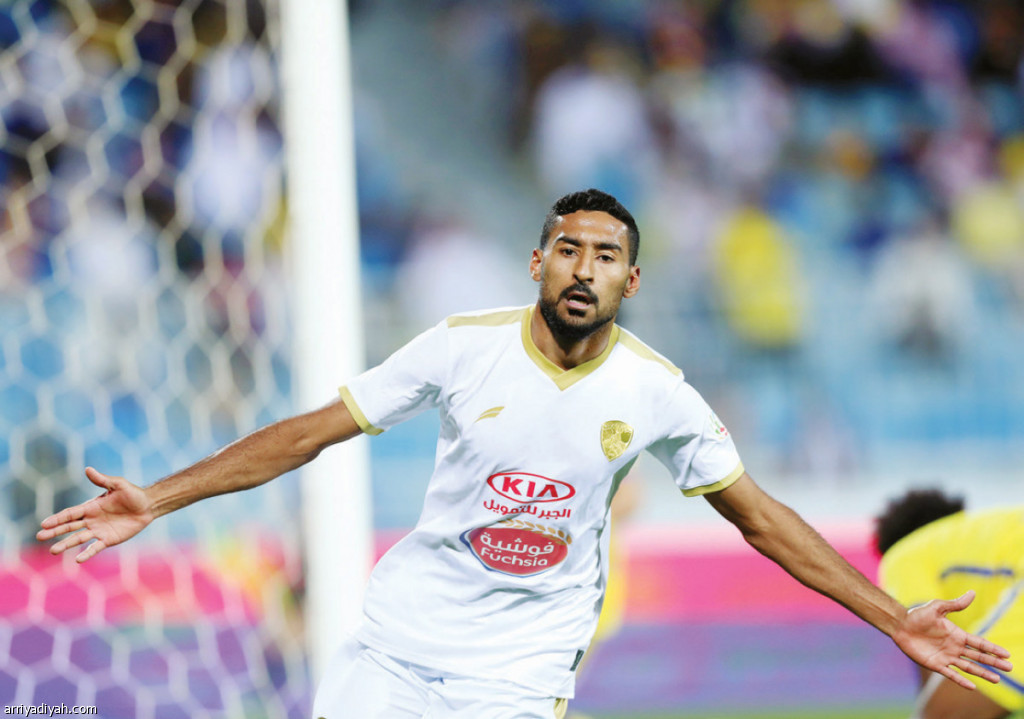 صورة التقطت أمس لعلي الحسن لاعب فريق الفتح الأول لكرة القدم يحتفل بعد تسجيله هدف التعادل لفريقه في شباك النصر تصوير: فهد المري