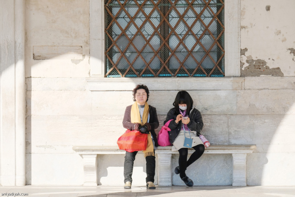 صورة التقطت أمس لسائحتين ترتدي إحداهما قناعًا وقائيًا من فيروس كورونا في مدينة البندقية في إيطاليا (رويترز)