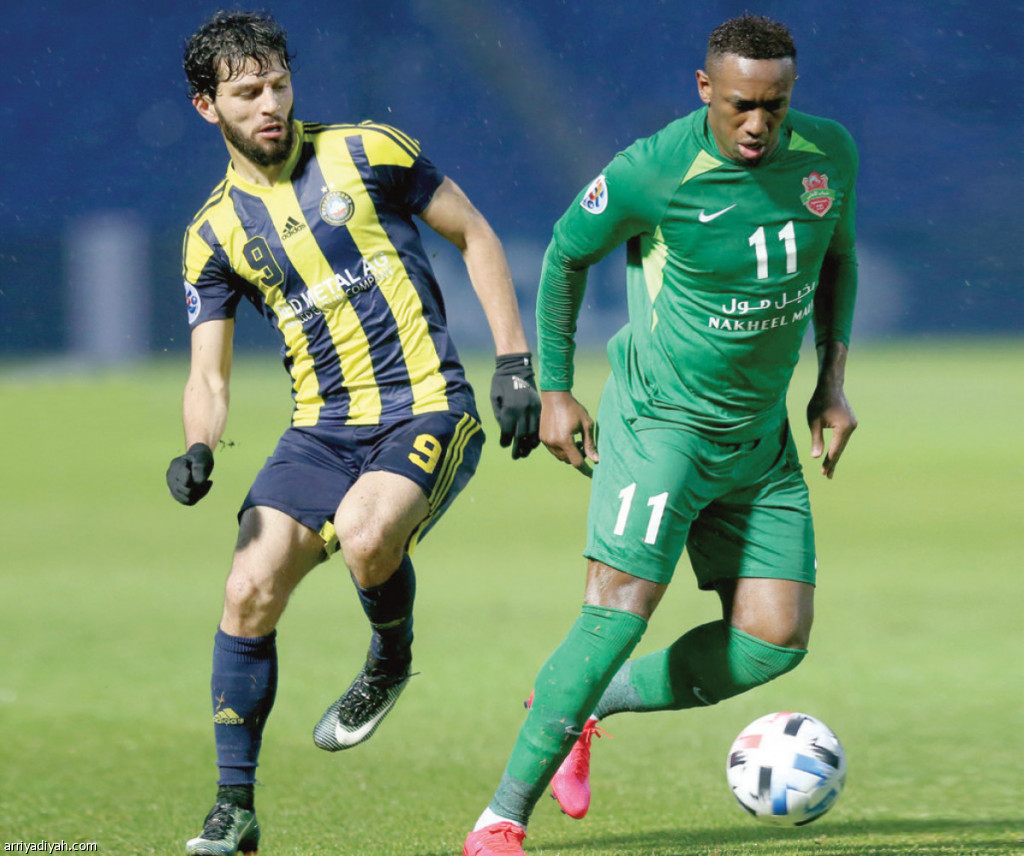 صورة التقطت أمس لأحمد خليل مهاجم شباب الأهلي دبي يحاول الهروب من ماشريبوف جناح باختاكور (المركز الإعلامي ـ شباب الأهلي دبي)