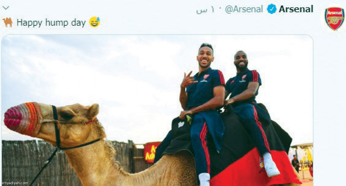 وضع حساب أرسنال الإنجليزي عبر تويتر صورة للجابوني إيميريك أوباميانج والفرنسي ألكساندر لاكازيت لاعبي الفريق يركبان جملاً في الإمارات. وعلق الحساب على الصورة بقوله “يوم سنام سعيد”.