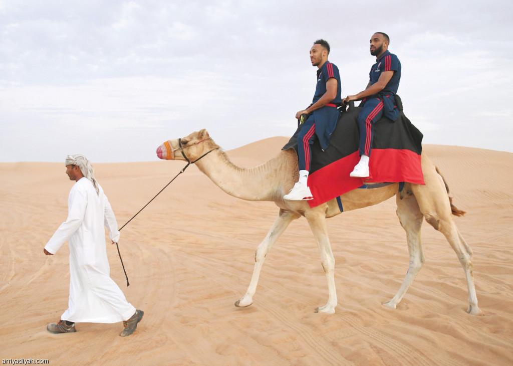 صورة التقطت أمس الأول يظهر الفرنسي ألكسندر لاكازيت والجابوني بيير أوباميانج لاعبا الفريق على ظهر جمل خلال رحلة سفاري صحراوي في ختام المعسكر (المركز الإعلامي ـ أرسنال)