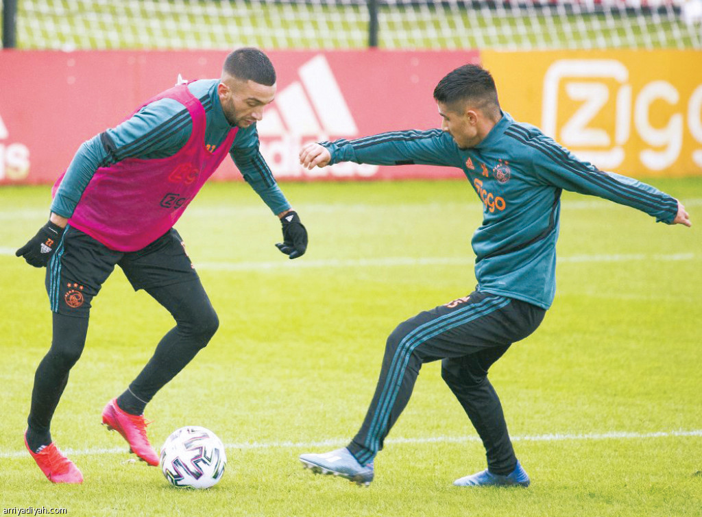 صورة التقطت أمس لزياش يحاول المرور من أحد زملائه أثناء تدريبات فريق أياكس (المركز الإعلامي ـ أياكس)