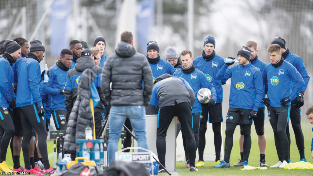 صورة التقطت أمس الأول للاعبي هيرتا برلين أثناء الحصة التدريبية للفريق استعدادًا للقاء بادربورن (المركز الإعلامي ـ هيرتا برلين)