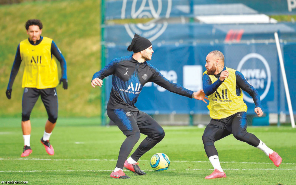 صورة التقطت أمس للبرازيلي نيمار يحاول المرور من الأرجنتيني ماورو إيكاردي أثناء تدريبات فريق باريس سان جيرمان (المركز الإعلامي ـ باريس سان جيرمان)