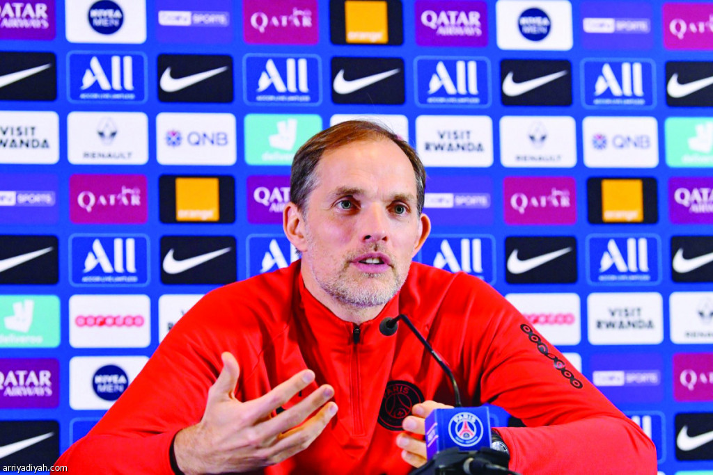 صورة التقطت أمس لتوخيل متحدثًا في المؤتمر الصحافي (المركز الإعلامي ـ باريس سان جيرمان)