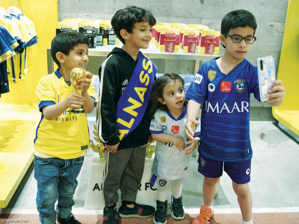 صورة التقطت أمس لطفل هلالي يأخذ سيلفي مع طفلين نصراويين وطفلة هلالية خلال وجودهم في متجر النصر تصوير: بشير صالح