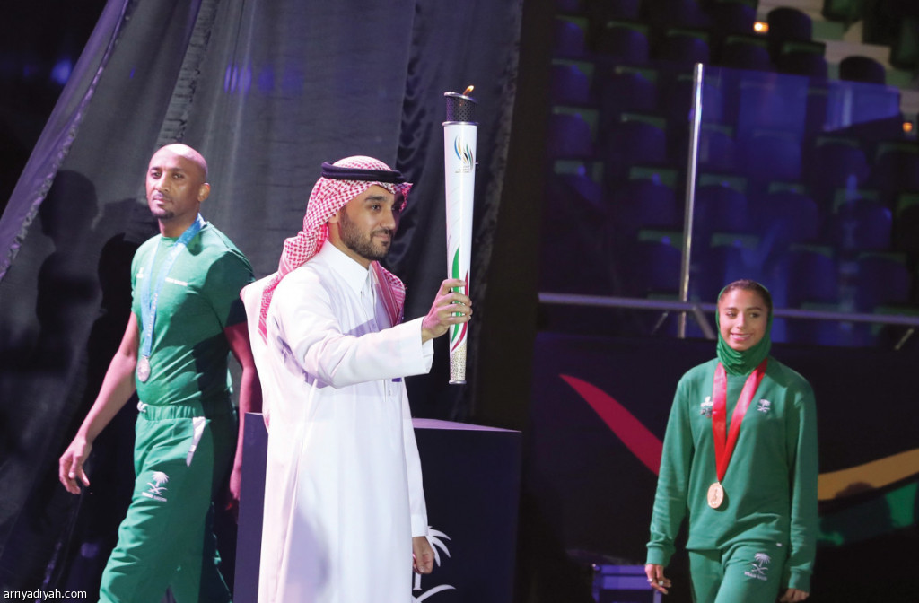 صورة التقطت أمس لعبد العزيز الفيصل وزير الرياضة رئيس مجلس إدارة اللجنة الأولمبية العربية السعودية يحمل شعلة دورة الألعاب السعودية في المؤتمر الصحافي الخاص بالبطولة التاريخية تصوير: صالح الغنام