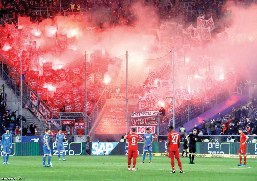 صورة التقطت أمس الأول لمشجعي بايرن ميونيخ يشعلون الألعاب النارية ويرفعون الهتافات المسيئة تجاه هوب الداعم لنادي هوفنهايم (الفرنسية)