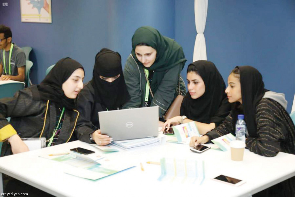 صورة التقطت أمس لمجموعة من الطالبات المشاركات في ورش عمل مؤسسة الملك عبد العزيز ورجاله للموهبة والإبداع (واس)