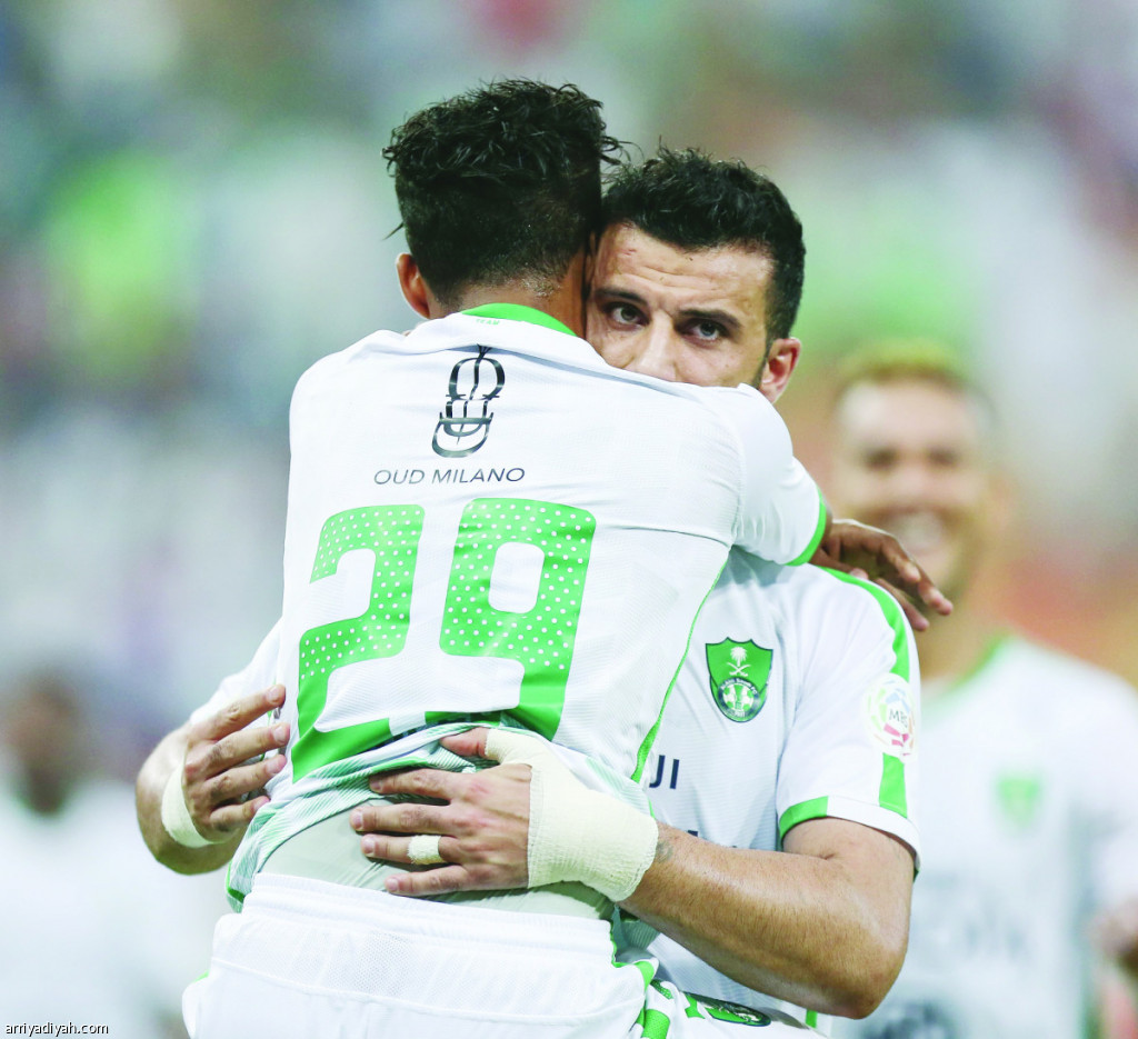 صورة التقطت أمس لعمر السومة مهاجم الأهلي يحتضن عبد الرحمن غريب بعدما صنع هدفه القاتل في مرمى الفيحاء تصوير: وهبان خبتي