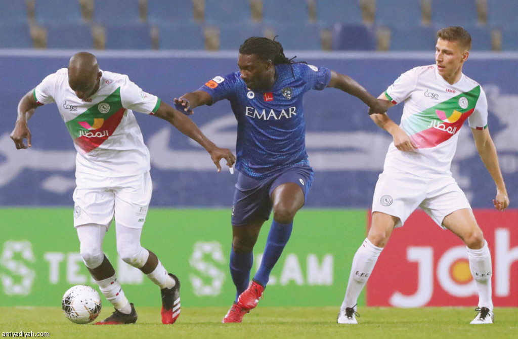 صورة التقطت أمس للفرنسي جوميز مهاجم الهلال يحاول قطع الكرة من السنغالي دوكارا لاعب الاتفاق تصوير: سعد العنزي
