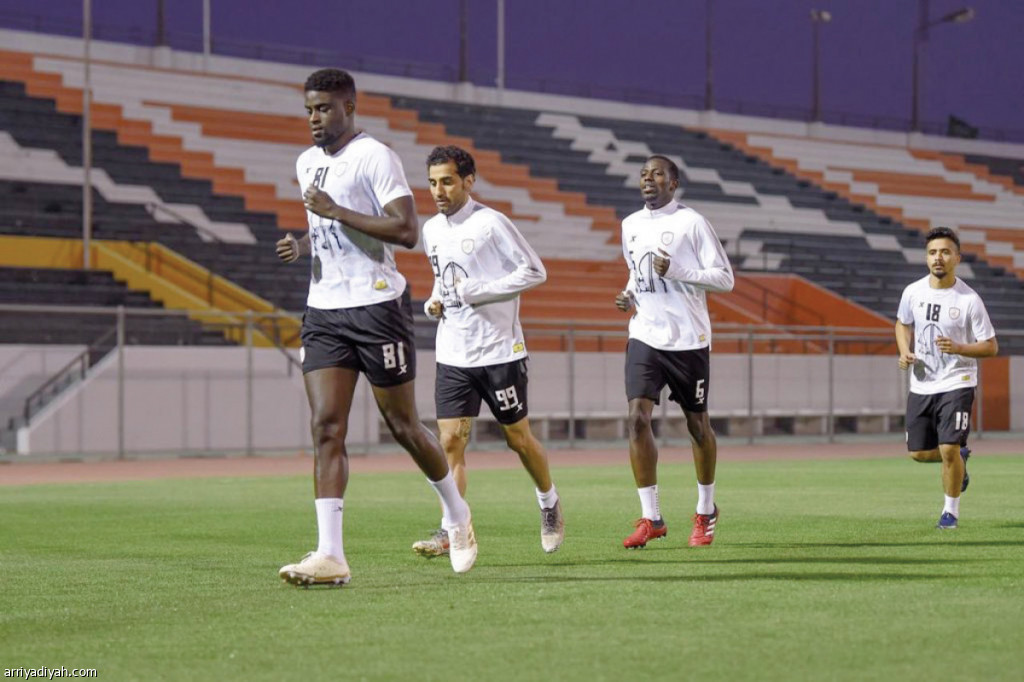 صورة التقطت أمس للسنغالي ألفريد ندياي محور الشباب وحسن الراهب المهاجم وعبد الملك الخيبري المحور يركضون خلال الحصة التدريبية (المركز الإعلامي - الشباب)