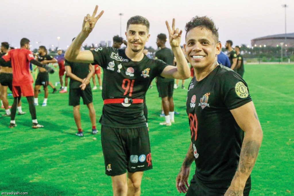 صورة التقطت أمس للثنائي البرازيلي إلتون وجوستافو لاعبي الوحدة أثناء التدريبات (المركز الإعلامي ـ الوحدة)