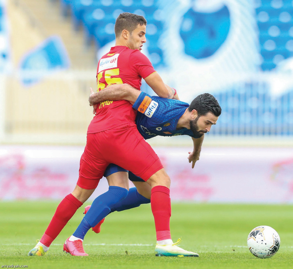 صورة التقطت أمس لعمر خربين مهاجم فريق الهلال الأول لكرة القدم يخوض صراعًا بدنيًا مع التونسي غازي العيادي لاعب وسط ضمك تصوير: سعد العنزي