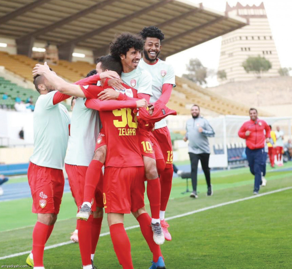صورة التقطت أمس للاعبي ضمك يحتفلون مع الأرجنتيني إيميليو زيلايا مهاجم الفريق بعد تسجيله في مرمى الهلال (المركز الإعلامي ـ ضمك)