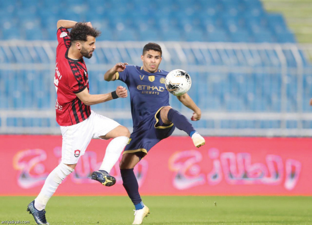 صورة التقطت أمس ليحيى الشهري لاعب وسط النصر يلمس الكرة قبل تدخل محمد العمري ظهير الرائد (المركز الإعلامي ـ رابطة الدوري)