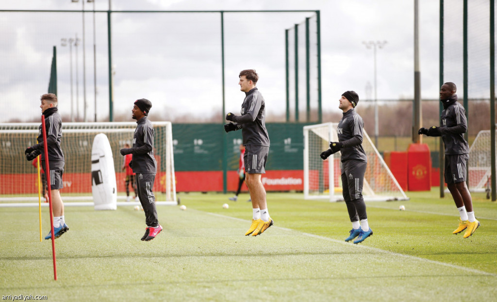 يحل فريق مانشستر يونايتد الإنجليزي ضيفاً على فريق لاسك لينز اليوم على ملعب لينزر في مباراة ذهاب دور الـ 16 من الدوري الأوروبي.. وفي الصورة التي التقطت أمس دانييل جيمس وأنجيل جوميز وهاري ماجواير ولوك شو يقفزون خلال تدريبات الفريق الجماعية استعداداً للقاء