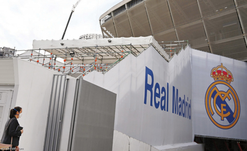 صورة التقطت أمس لامرأة ترتدي واقيًا تمر أمام ملعب سانتياجو بيرنابيو في مدريد العاصمة الإسبانية (الفرنسية)