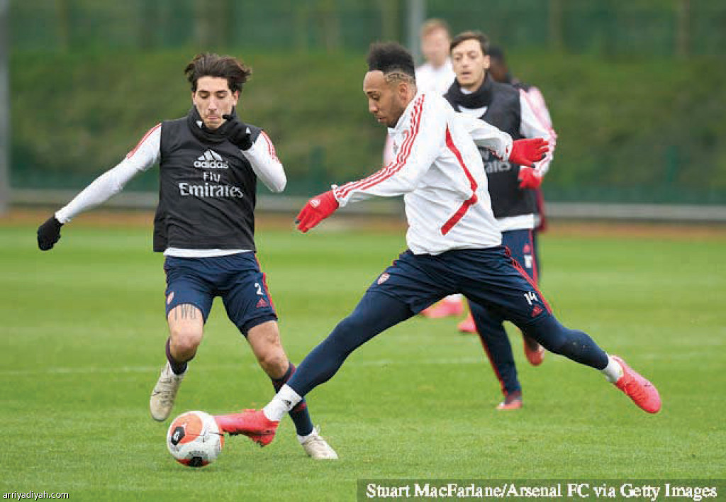 صورة التقطت أمس الأول لأوباميانج يحاول المرور من الإسباني هيكتور بيلرين في تدريبات الفريق (المركز الإعلامي ـ أرسنال)