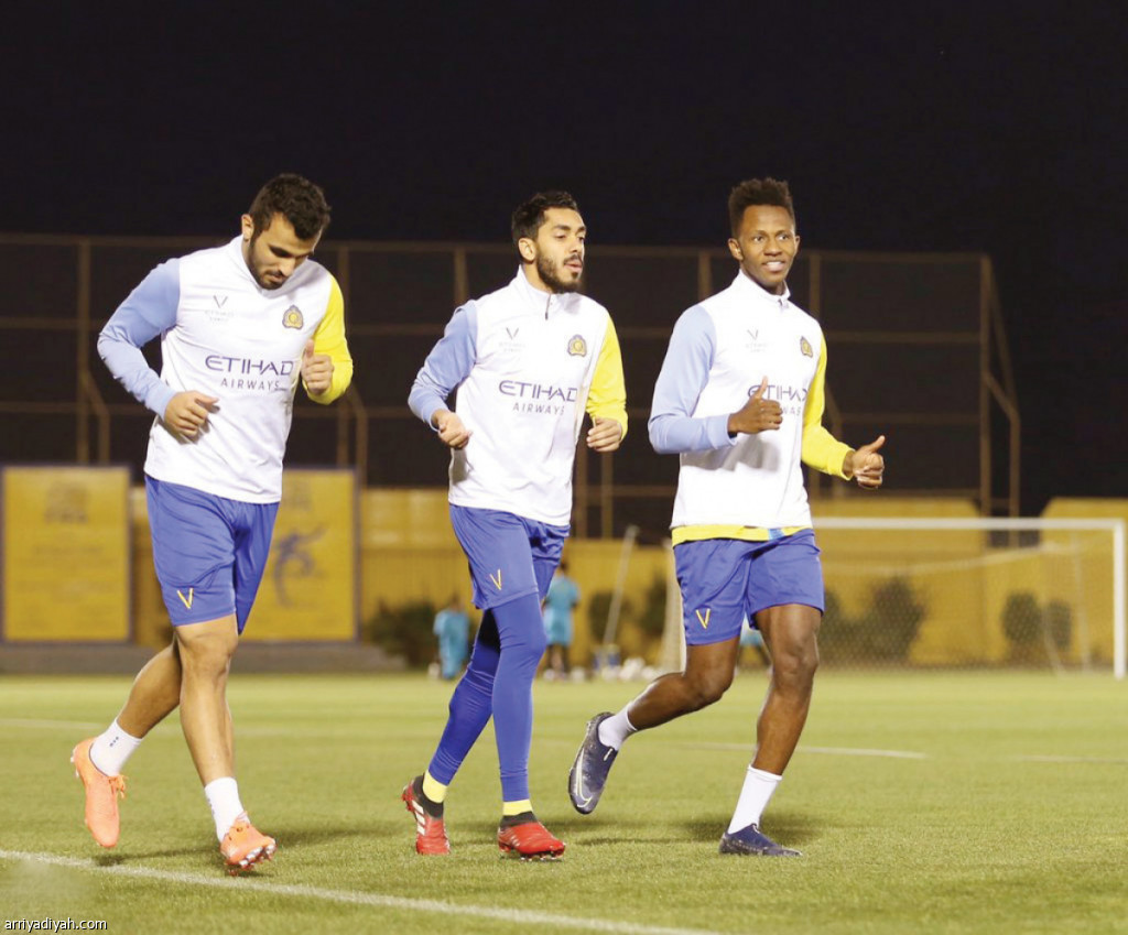 صورة التقطت أمس لعبد الفتاح آدم وعبد العزيز الدوسري وحمد آل منصور ثلاثي فريق النصر في التدريبات (المركز الإعلامي ـ النصر)