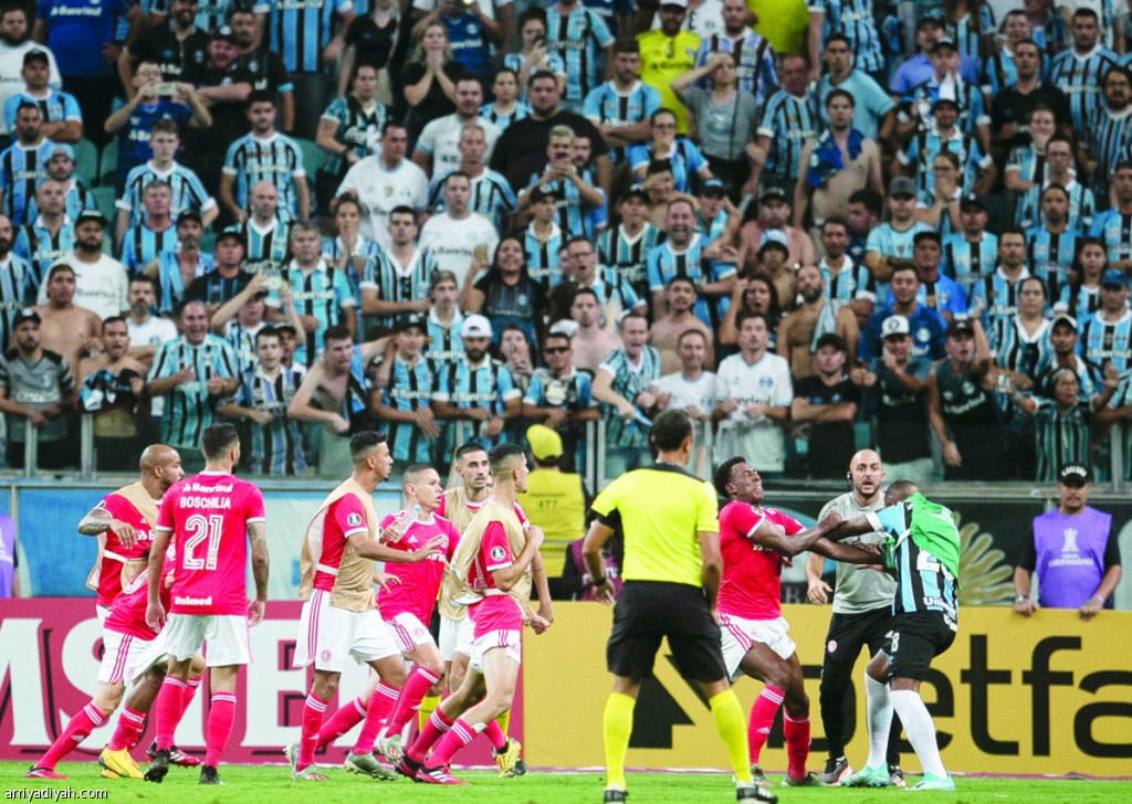 شهد ديربي مدينة بورتو أليجري البرازيلية عراكًا بين لاعبي فريق إنترناسيونال وجريميو بورتو أليجري ما أدى إلى طرد ثمانية لاعبين في المباراة التي جرت ضمن كأس ليبرتادوريس وانتهت 0-0. .وفي الصورة التي التقطت أمس يظهر ميراندا يخوض وحيدًا عراكًا مع لاعبي إنترناسي