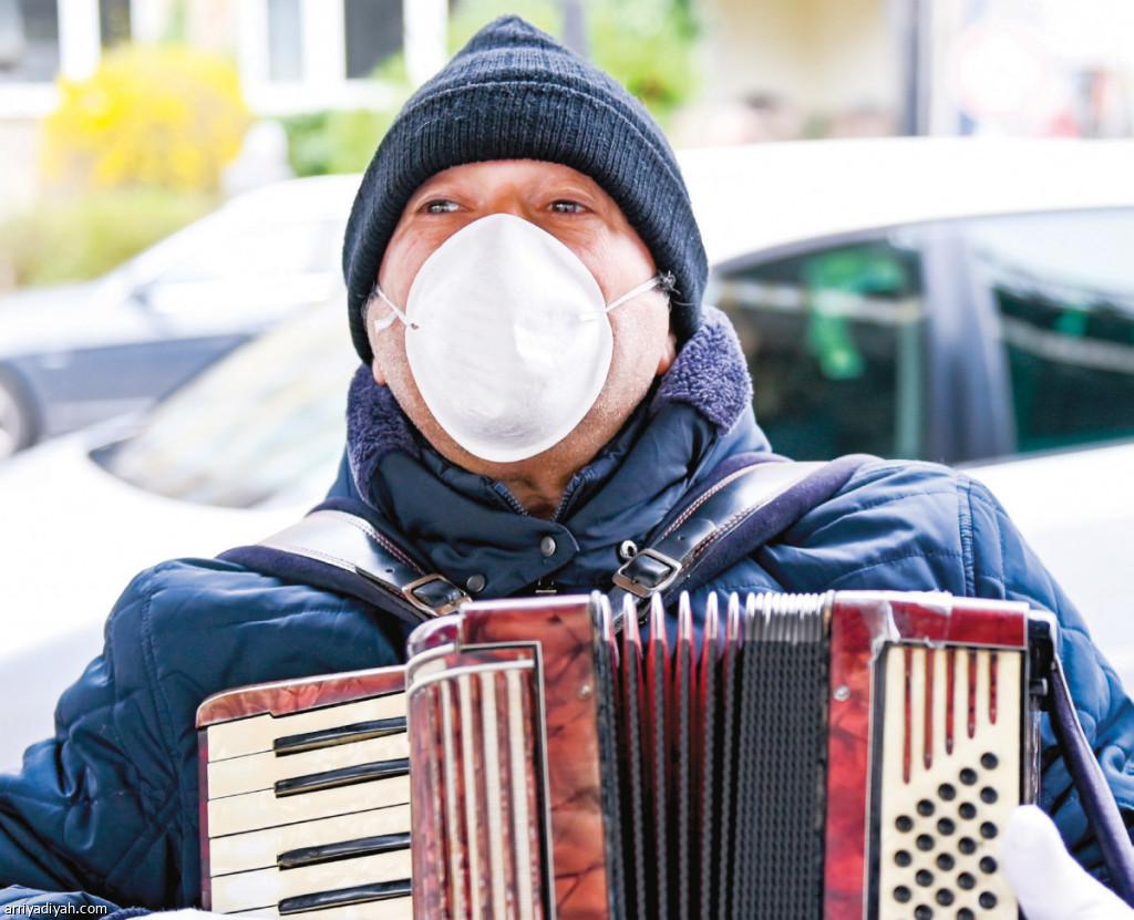 تسبب فيروس كورونا في توقف الحفلات الموسيقية والغنائية في جميع أنحاء العالم.. وفي الصورة التي التقطت أمس عازف موسيقى يرتدي كمامة وقفازات أثناء عزفه مقطوعة موسيقية على آلة الأكورديون في أحد أسواق مدينة هامبورج الألمانية