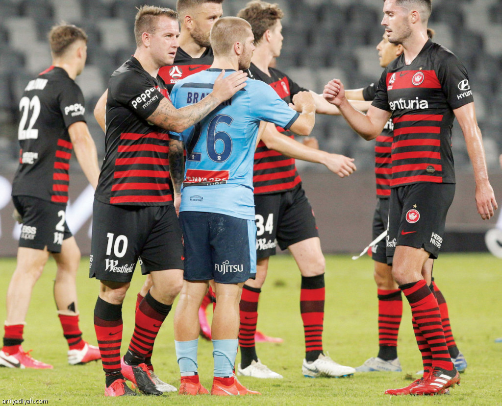 صورة التقطت أمس لاعبو سيدني وويسترن يتبادلون التحية عقب نهاية المباراة (الفرنسية)