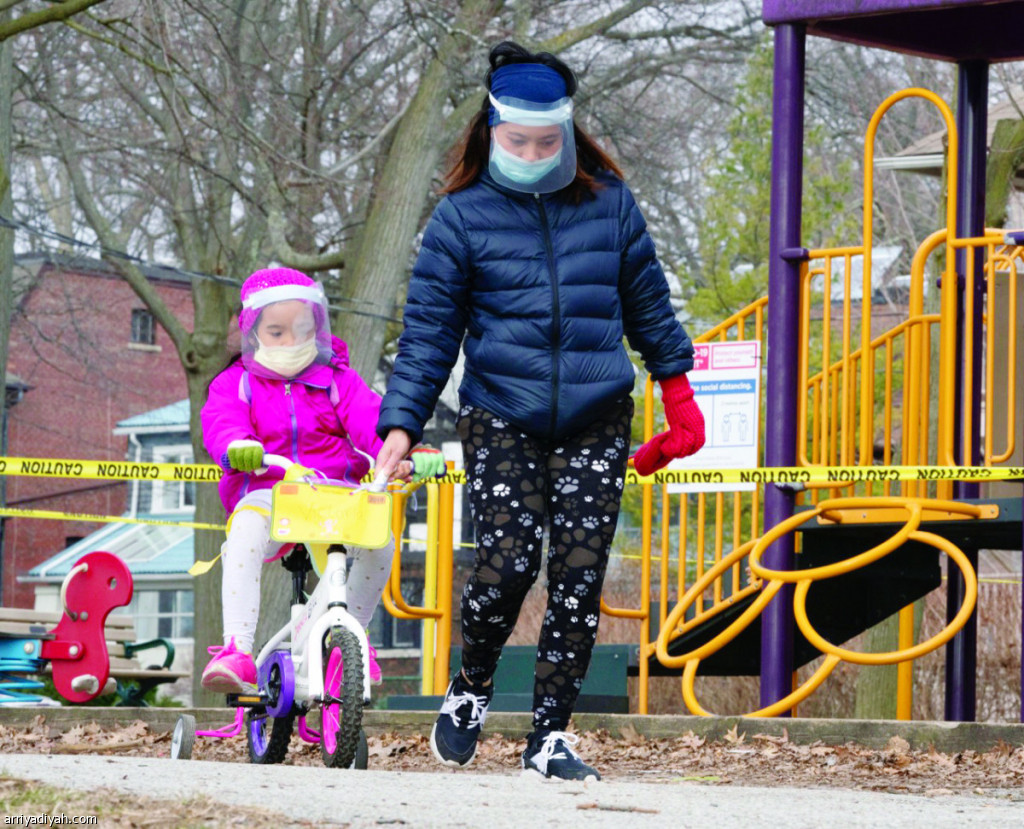 صورة التقطت أمس لامرأة وطفل يرتديان أقنعة ودروع وجه كاملة وذلك في إحدى الحدائق العامة في تورونتو في كندا حيث تعرضت لعدد من الإصابات بالوباء (أسوشيتد برس)