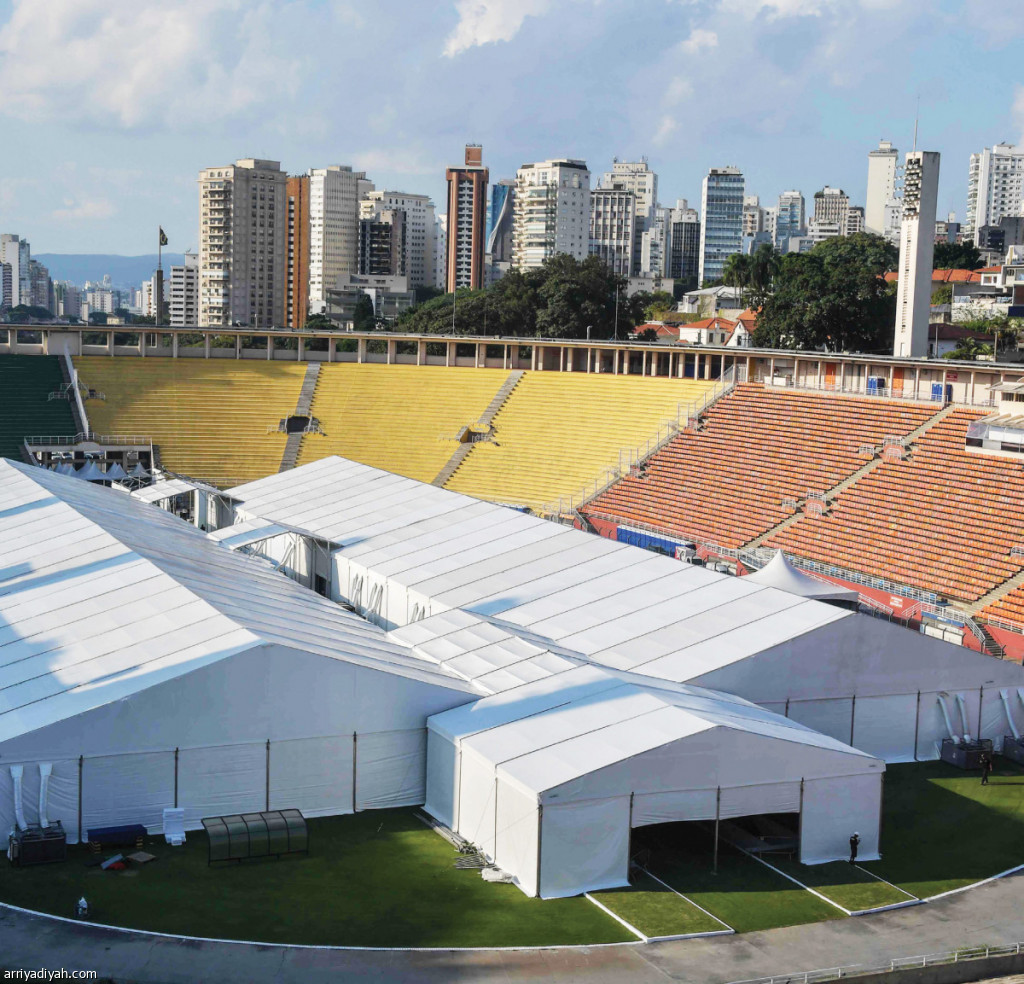 تحوَّلت ملاعب كرة القدم في البرازيل إلى مستشفيات وعيادات ميدانية مؤقتة لعلاج مرضى فيروس كورونا المستجد “كوفيد 19”.. وفي الصورة التي التقطت أمس يظهر مستشفى ميداني على أرضية ملعب باكايمبو الخاص بفريق ساوباولو بعد اكتمال نصبه (الفرنسية)