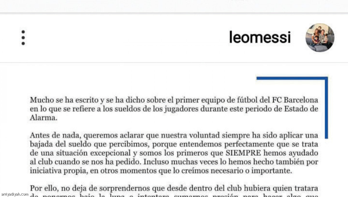 اكتسح بيان الأرجنتيني ليونيل ميسي، لاعب فريق برشلونة الإسباني، حول تنازله وزملائه في الفريق عن 70 في المئة من رواتبهم، التفاعل الأكبر في إنستجرام على مدى الـ 24 ساعة الماضية، حيث وصل تداول البوست إلى 13.8 مليون.