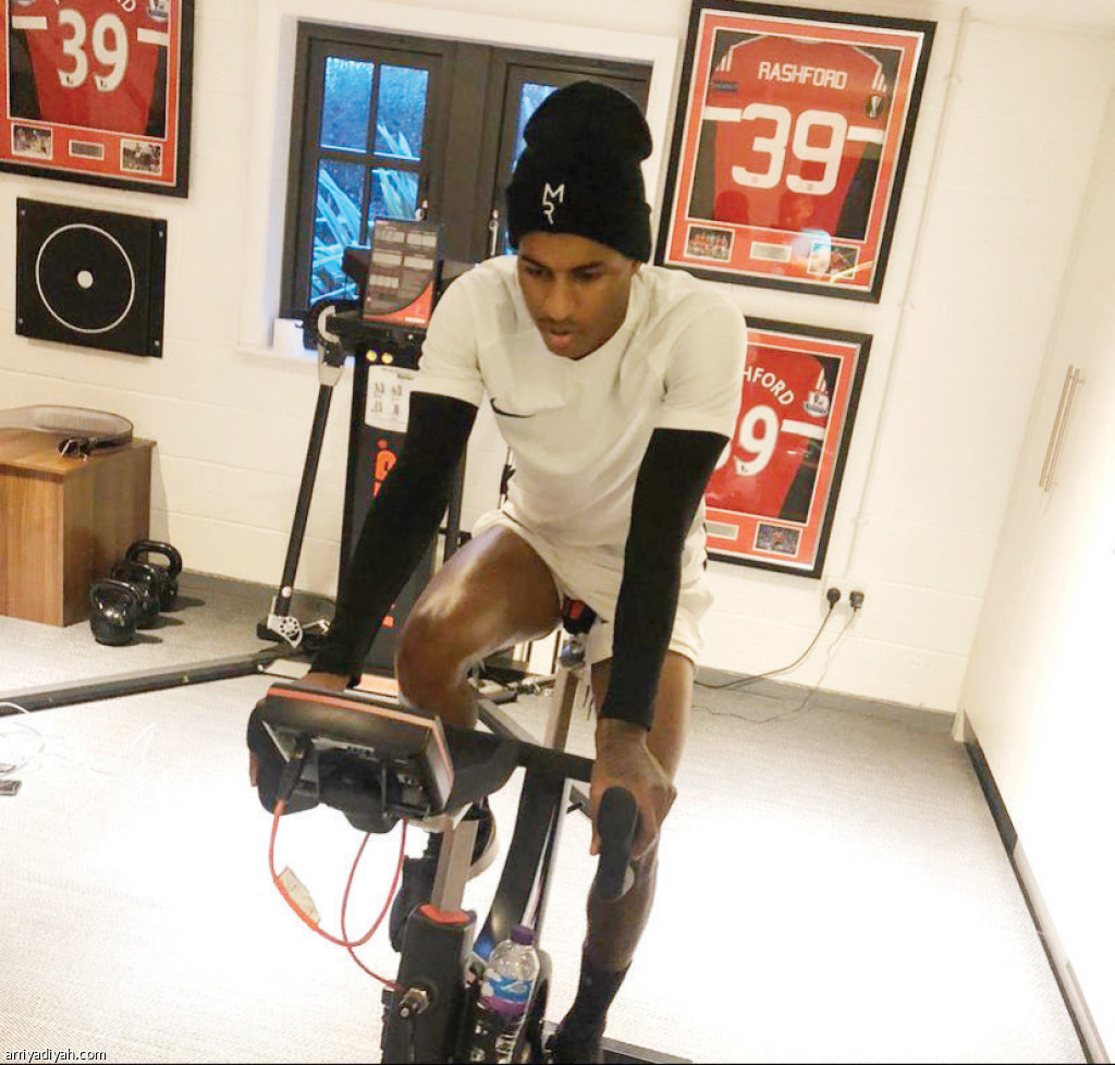 صورة التقطت أمس الأول لماركوس راشفورد مهاجم مانشستر يونايتد أثناء التدريبات المنزلية (حساب راشفورد على تويتر)