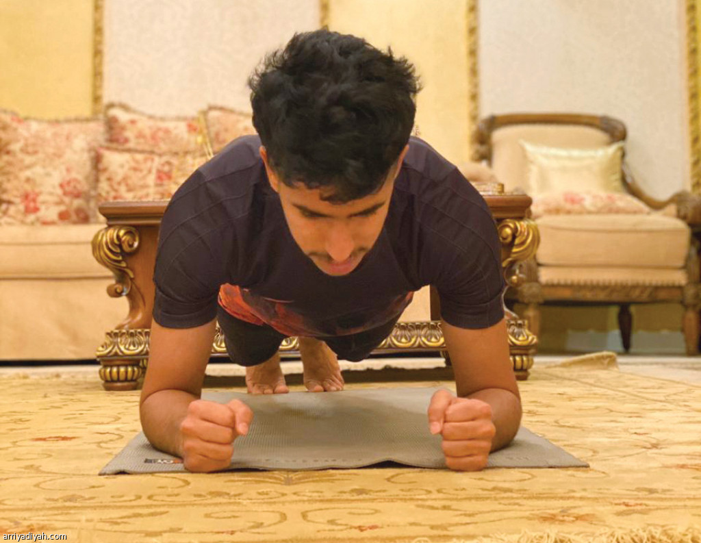 يحرص أيمن الحجيلي لاعب فريق ضمك الأول لكرة القدم على أداء تدريبات مسائية في منزله في المدينة المنورة بعد تعليق النشاط الرياضي ضمن الإجراءات الاحترازية لمواجهة فيروس كورونا.