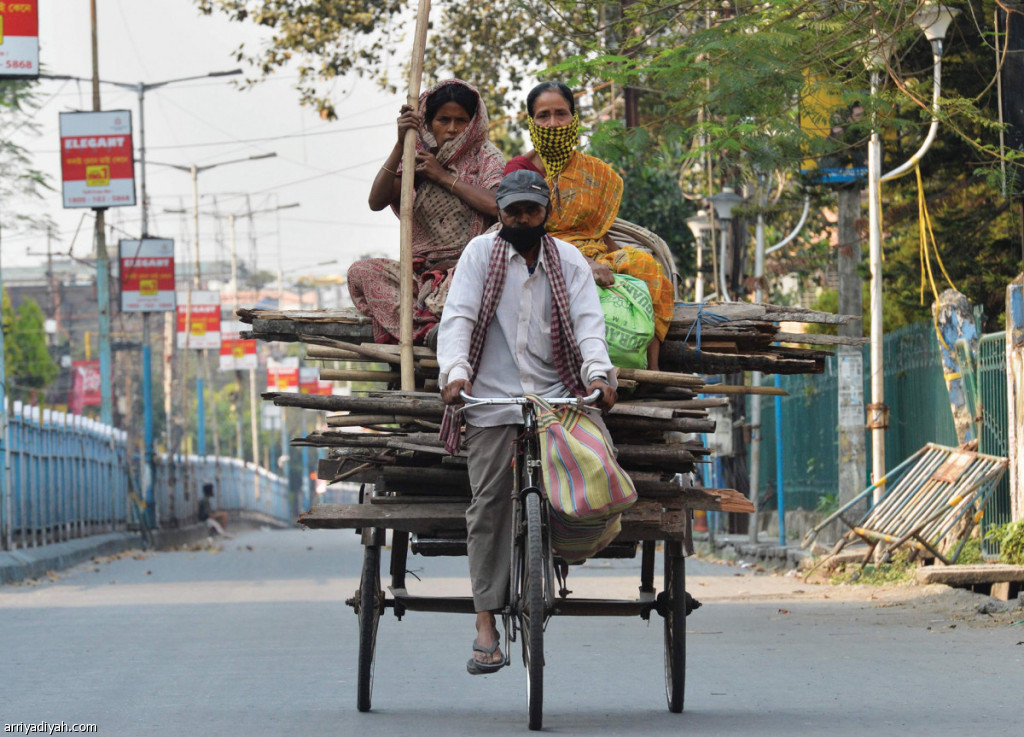 تواصل الهند مكافحة فيروس كورونا على المستويات كافة.. وفي الصورة التي التقطت أمس عائلة تحمل الحطب على عربة تمهيدًا لبيعها في السوق رغم منع التجول المفروض في مدينة سيليجوري الهندية