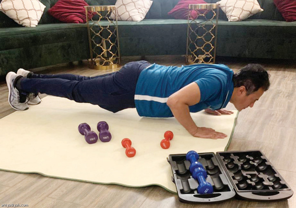 صورة التقطت أمس لمرعي العواجي يؤدي تدريبات لياقية في صالة منزله بحي ظهرة لبن في الرياض ضمن برنامجه اليومي خلال فترة البقاء في المنزل في اطار الاجراءات الاحترازية امواجهة فيروس كورونا (صورة خاصة بالرياضية)