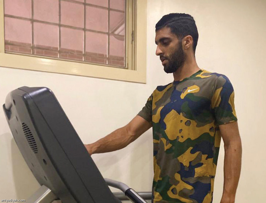 صورة التقطت أمس لأحمد محيميد لاعب فريق الجبلين الأول لكرة القدم أثناء تدريباته المنزلية (صورة خاصة بالرياضية)