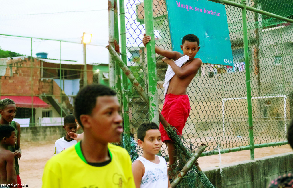 صورة التقطت أمس الأول لصبي يتعلق بسور ملعب شعبي في حي مانجوينوس الفقير شمال مدينة ريو دي جانيرو البرازيلية.. ويظهر حوله ثلاثة من أقرانه فيما يبدو الملعب خاويًا(رويترز)