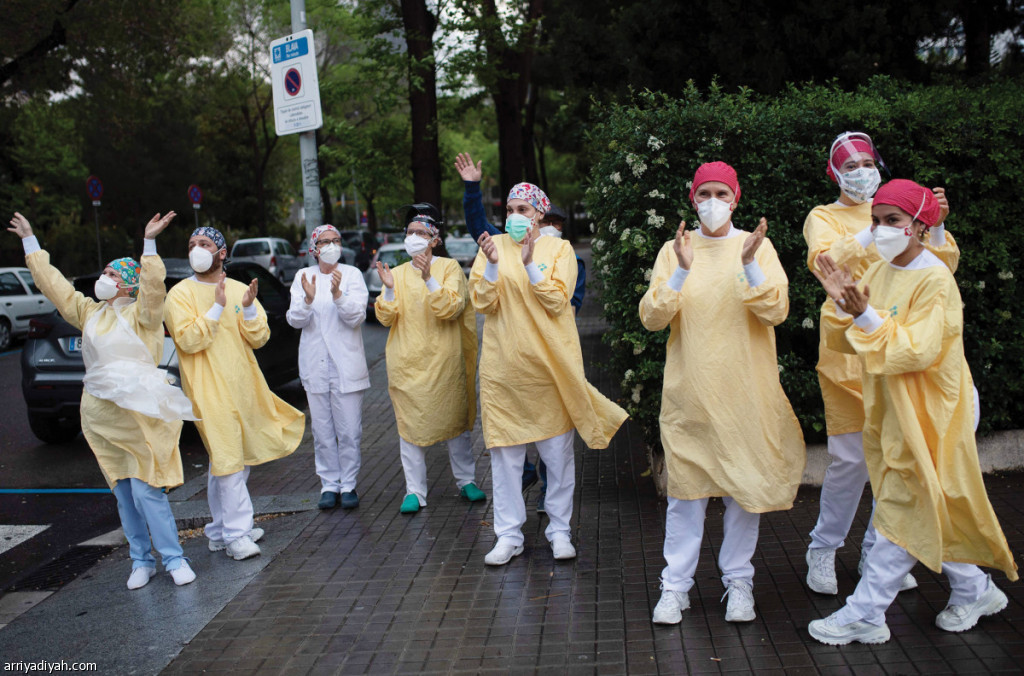 صورة التقطت أمس لأعضاء من الطاقم الطبي لأحد مستشفيات مدينة برشلونة الإسبانية يردون تحية تلقونها نظير جهودهم في علاج مصابي فيروس كورونا (الفرنسية)