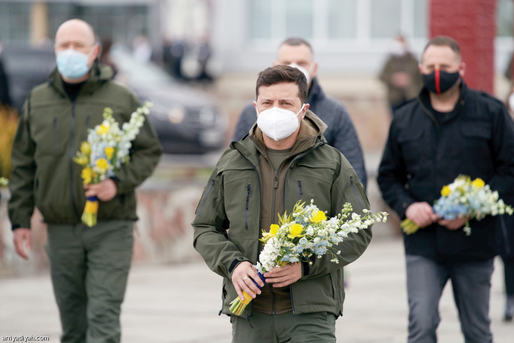 صورة التقطت أمس لفولوديمير زيلينسكي الرئيس الأوكراني يرتدي كمامة ويمسك بباقة ورد لوضعها عند نصب في تشرنوبل(رويترز)