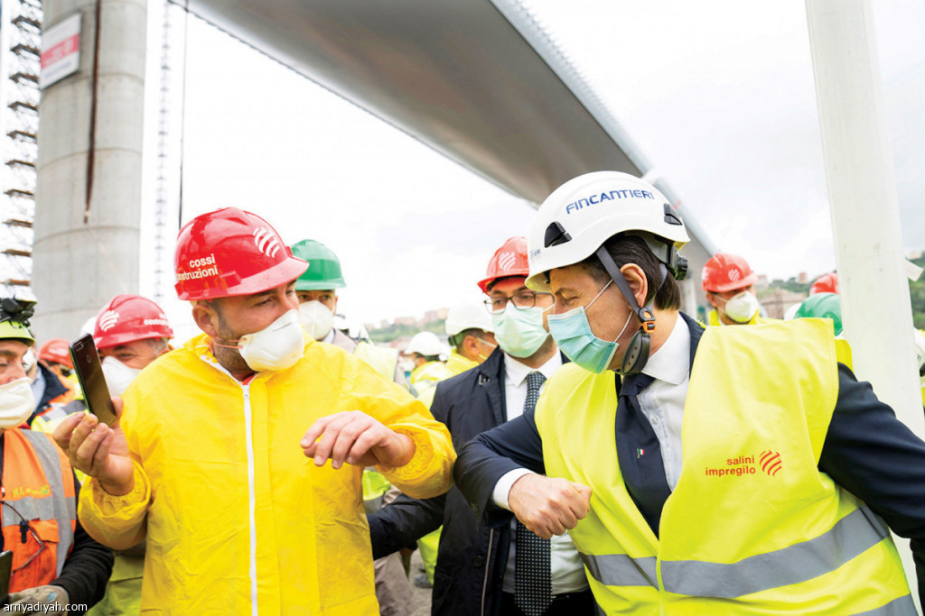 صورة التقطت أمس لجوزيبي كونتي رئيس الوزراء الإيطالي يرتدي قناع الوجه الواقي ويحيي أحد المهندسين عند افتتاح الجسر (رويترز)